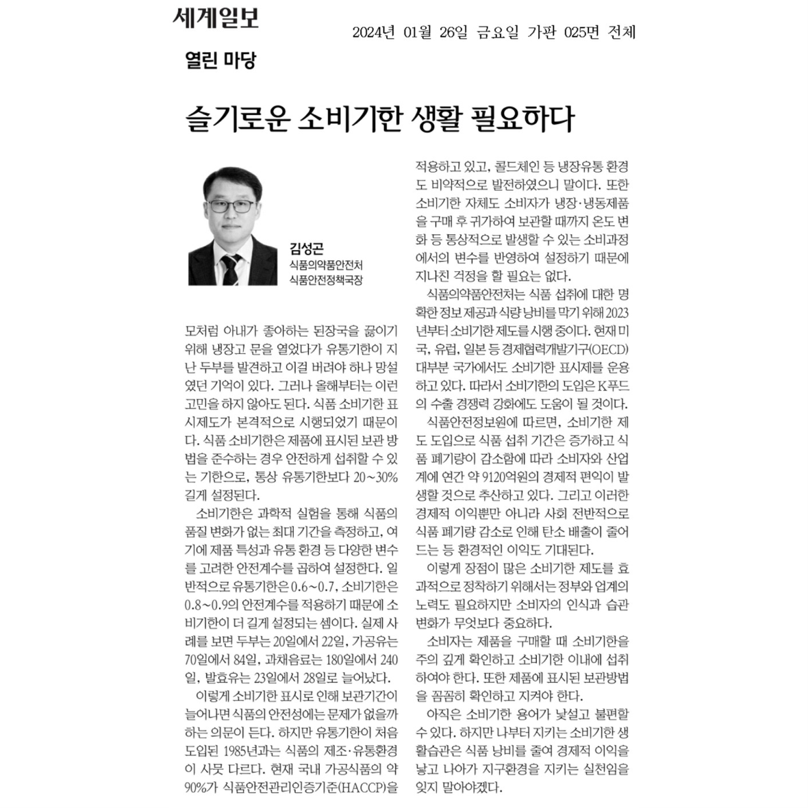 "슬기로운 소비기한 생활 필요하다"'소비기한'은 식품 등의 표싣힌 보관방법을 준수할 경우 섭취해도 안전에 이상이 없는 기한을 말합니다."소비기한 제도는 식품 섭취 기간은 증가하고 식품 폐기량이 감소함에 따라 경제적 편익이 발생하고 식품 폐기량 감소로 탄소 배출이 줄어 환경적 이익도 기대된다"-식품의약품안전처 식품안전정책국장 김성곤-우리도 안심! 환경도 안심!소비기한 제도와 함께 슬기로운 생활을 해볼까요?